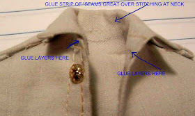 Typically, safari jackets are not lined. At this point, however, it will look a bit rough in the front of the collar. That is why it is important to glue the layers flat. To further disguise the rough edges and stitches around the neck, I've used a product called "Seams Great" by Dritz, a 1/2 inch sheer seam tape. Cut to fit the inner neckline and glue the tape down.