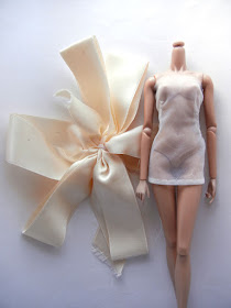 Case in point.... Sybille’s dress is a strapless sheath gown. It was cut all in one piece. I simply cut the fabric away in the front to expose her midriff and a smaller area over the top of her thighs. The back of her gown is all in one piece. Though I have added “straps” over each shoulder, the use of the string on this dress is purely decorative!